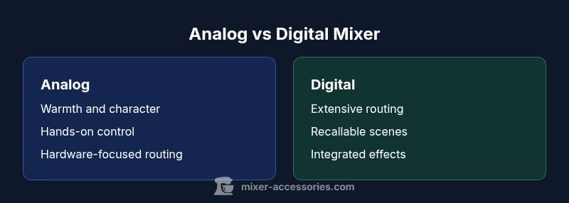 When you hear the term analog mixer vs digital mixer, you’re looking at two distinct signal paths and design philosophies. An analog mixer processes audio signals entirely in the electrical domain with discrete components, delivering a tactile, hands-on mix experience. A digital mixer, by contrast, routes audio through a digital engine, using software to perform routing, effects, and channel recalls. This distinction matters not only for sound quality, but for workflow, integration with a computer or DAW, and how you approach maintenance. For many hobbyists and professionals alike, the choice is less about “which sounds better” and more about which path aligns with your goals, room, and daily use. According to Mixer Accessories, the decision often comes down to how you value warmth and immediacy versus flexibility and recallability in real-world scenarios.
