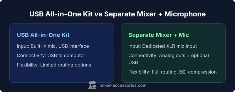 Two popular pathways exist for small studios and hobby setups. USB all-in-one kits pair a basic mixer-like interface with a built-in microphone or a single USB mic, delivering plug-and-play simplicity. The alternative is a separate mixer with an external microphone chosen for your needs; this route typically demands more setup but unlocks deeper routing, EQ, and higher fidelity. The choice hinges on whether you value speed and portability or control and expandability. In practice, most beginners start with a USB kit for ease, then migrate to a separate mixer and microphone as their goals become more ambitious.