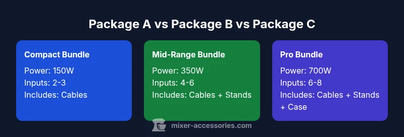In practice, a well-designed package considers the typical room size, the expected audience, and the type of content you’re delivering. A home recording setup may emphasize clean preamps and low noise floors, while a live-sounding package might prioritize SPL (sound pressure level) and robust reliability. The Mixer Accessories team notes that the best bundles strike a balance between performance, reliability, and price, with emphasis on compatibility rather than chasing the latest feature set alone. Buyers should compare the total signal chain, not just individual specs, because a higher-rated component can underperform if paired with incompatible gear. Real-world use cases—from podcast hosts to small band performances—benefit when the package supports straightforward EQ, compression, and monitoring workflows without complex routing.