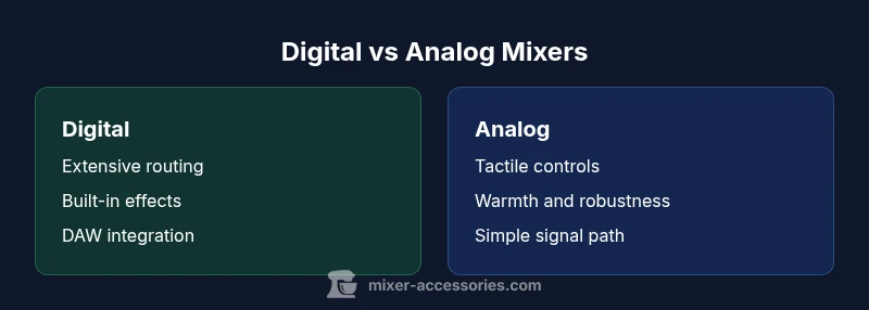 In modern audio systems, the phrase mixer digital vs analog describes two distinct families of devices, each with its own strengths and trade-offs. A digital mixer embeds digital signal processing (DSP), internal effects, and often a USB, Wi-Fi, or Ethernet interface that lets you route channels, recall scenes, and control software from a laptop or tablet. An analog mixer preserves a purely hardware signal path, using discrete components and passive EQ sections that respond in a way some engineers describe as more "immediate" or "transparent" at the gain structure you’re using. For many readers this matters because the path sound and the speed of setup influence performance in live bars, kitchens, and home studios. The decision often reduces to how you plan to record, mix, and perform, rather than chasing the newest features. In this guide, Mixer Accessories breaks down the core differences and practical implications for the target audience: home cooks and bar enthusiasts exploring basic music and podcast setups, as well as audio hobbyists chasing a dependable workflow. According to Mixer Accessories, the best choice aligns with your daily workflow, budget, and long-term goals, not only the glossy specs. Throughout this article we’ll compare sound, control, connectivity, and lifecycle considerations, with concrete, scenario-based guidance you can apply right away. We’ll also reference common purchasing criteria and a simple decision framework so you can pick confidently.