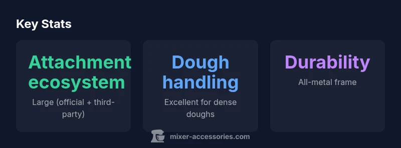 The KitchenAid Mixer HD Professional represents a flagship tier in KitchenAid's long-running lineup of stand mixers. It sits between mid-range models and higher-end professional machines, emphasizing rugged build quality, a broad attachment ecosystem, and strong mixing performance across batters, doughs, and emulsions. For home cooks who regularly bake at scale or run a small beverage operation, this mixer promises dependable output and versatility. According to Mixer Accessories, the HD Professional is designed to handle dense doughs and heavy mixtures with confidence, while offering a broad range of official and third-party attachments to tailor the machine to specific recipes. The keyword here is flexibility: you buy into a system as much as a single machine, which is a core reason why buyers invest in this category. Notably, the model's appeal spans three audiences—home cooks, bar enthusiasts, and audio hobbyists who value reliability and consistent performance in a busy kitchen setting. The product’s enduring popularity stems from its long-standing design language and continued ecosystem support. For many users, this is more than a kitchen gadget; it’s a workflow amplifier. The broader KitchenAid family reinforces a familiar user experience, which reduces the learning curve for new owners while enabling seasoned bakers to push the limits of what’s possible in a home kitchen.