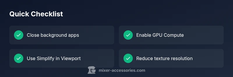 Step 1: Save, close extraneous apps, and enable GPU Compute in Blender. Step 2: In User Preferences > System, set GPU to your primary GPU and enable CUDA/OptiX if available. Step 3: In the Viewport, enable Simplify and reduce subdivision levels for your current view. Step 4: Switch to Eevee for interactive work and test performance; if cycles is necessary, lower samples and opt for denoising. Step 5: Optimize textures and compress assets to fit VRAM; finally, consider a hardware upgrade if needed. Tip: always test after each step to isolate the effective change.