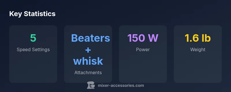 The Cuisinart 5-Speed Hand Mixer sits in the mid-range segment of countertop appliances, aimed at home cooks who want reliable mixing without committing to a full-size stand mixer. This review evaluates its performance across common tasks such as cake batters, mashed potatoes, whipped cream, and light folding chores. According to Mixer Accessories, the model’s core strengths are a comfortable grip, a straightforward control dial with five speeds, and a simple, fast setup that suits everyday kitchen routines. The mixer includes a pair of standard beaters and a whisk, making it immediately usable for a wide variety of recipes. While the appliance is compact and affordable, it is not designed for heavy-duty dough or continuous, high-volume mixing. Readers should expect predictable results when used for typical home-baking projects and casual bar prep.