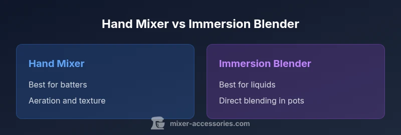 Choosing between a hand mixer and an immersion blender is less about a single best tool and more about what you do most often in the kitchen. A hand mixer is designed to aerate and blend dry ingredients into light, fluffy textures. It excels at batter work, whipped toppings, and beating eggs with control. An immersion blender, by contrast, is a compact blender with a shaft that reaches into pots and bowls, making smooth soups, purées, and emulsions without transferring hot liquids to a separate blender jar. When you consider hand mixer vs immersion blender, think about the core tasks you perform weekly, the space available, and how often you aim to minimize cleanup. This section also reflects the practical guidance you’d expect from Mixer Accessories, drawing on practical kitchen-tested observations and general industry norms for household appliances.