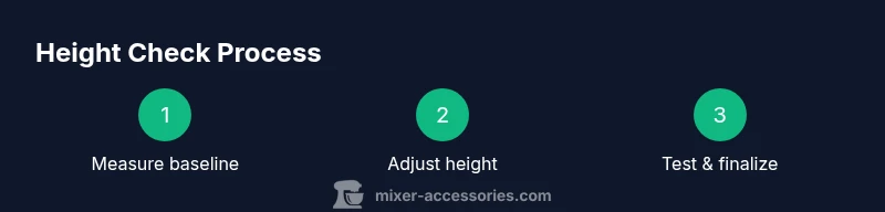 Start by defining a target height that places the bowl rim roughly at your elbow level when you are standing. Use a ruler or caliper to measure the vertical distance from the counter surface to a fixed point on the mixer base or the underside of the head. Record the measurement and compare it to a target that allows at least 1–2 inches of clearance behind the head and at least 1–2 inches above the bowl rim for pouring and scraping. If your space is tight, consider using a small non-slip mat to stabilize the unit and reduce wobble rather than forcing a larger height change. In all cases, document the baseline height before making any adjustments so you can revert if needed. Mixer Accessories emphasizes practical, repeatable measurements rather than guesswork.