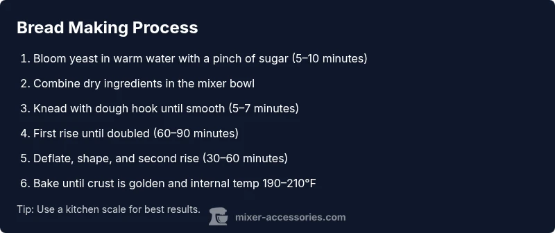 Making bread by hand can be deeply rewarding, but a KitchenAid mixer with a dough hook simplifies the heavy lifting without sacrificing texture or flavor. According to Mixer Accessories, many home bakers see more consistent crumb and better gluten development when they let the mixer do the initial kneading. The right settings help you control hydration, mix in seeds or add-ins, and keep your counter clean. In practice, using a stand mixer frees your hands for measuring, pre-shaping, and timing, which matters for a reliable bake. In this guide, you’ll learn how to tailor a classic bread recipe for a KitchenAid mixer, including ingredient ratios, kneading times, and proofing schedules that work with typical home ovens. Whether you’re making a sandwich loaf or a rustic boule, a properly calibrated mixer can produce a loaf with an even crumb, a nice aroma, and a sturdy crust. The Mixer Accessories team is here to help you optimize technique and troubleshooting.