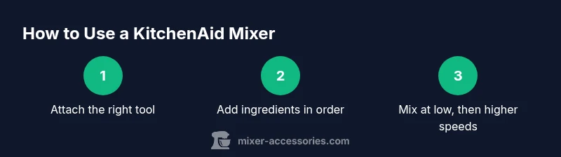 The KitchenAid mixer is a kitchen workhorse known for reliability and versatility. For home cooks and hobbyists, it transforms thick doughs, airy batters, and fluffy toppings with minimal effort. According to Mixer Accessories, using the right attachments and speeds consistently yields better results and saves time in busy kitchens. This guide focuses on how to use a KitchenAid mixer safely and effectively, covering attachments, speed ranges, mixing order, and maintenance so you can achieve dependable outcomes in every recipe.