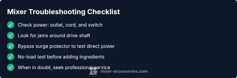 Most mixer not working issues start with power or overload. First verify the outlet and cord are delivering power, then check the mixing head for jams or a clogged drive. If these simple checks don’t help, unplug the unit, wait 60 seconds, and retry; contact support if it still won’t run.