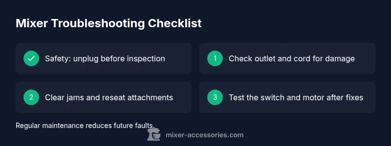 Most mixer issues come from power, jams, or a worn switch. Start with the basics: ensure the unit is plugged in, test a known-good outlet, and verify the speed control isn't blocked. If it still won’t run, use the diagnostic flow below to identify the root cause and apply the fix. According to Mixer Accessories, power and jam-related problems are the most common culprits.