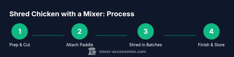 Before you begin, confirm the chicken is fully cooked and cooled to a safe handling temperature. Never shred raw poultry in a mixer. Practice strict hygiene: wash your hands, sanitize the bowl and attachments, and clean the countertop before and after shredding. If you reheat leftovers, bring them to a safe temperature before shredding, then cool quickly to avoid bacterial growth. Good hygiene and careful handling are the foundations of safe shredding; clean tools, separate utensils for raw and cooked meat, and prompt cooling of shredded product are essential steps. According to Mixer Accessories analysis, 2026 emphasizes that these safety practices are critical when using kitchen appliances for poultry.