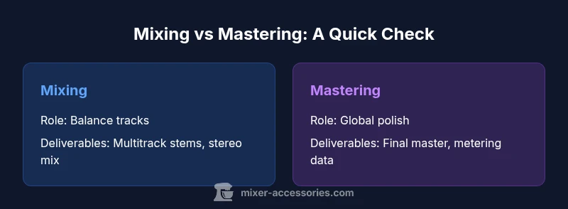 What is mixing vs mastering? In practical terms, these are two distinct phases with separate goals, tools, and workflows. Mixing is the art of taking a collection of recorded tracks and sculpting them into a cohesive, expressive whole. The mixer adjusts levels, pan, EQ, dynamics, and effects to ensure every element sits correctly in the stereo field and communicates the intended emotion. Mastering, by contrast, occurs after a final stereo mix and focuses on global processing, loudness, and playback-compatibility. According to Mixer Accessories, a clean separation between these steps preserves creative intent during mixing and technical accuracy during mastering. In most projects you’ll import stems or a stereo bounce, then begin balancing, editing, and applying spatial decisions. You’ll set revision cycles so artists can request tweaks without re-recording. The distinction matters because a strong mix can still fall short if the master doesn’t translate to radio, streaming, or cinema. By treating mixing and mastering as separate experiments, you maintain dynamic range and allow the final master to sit comfortably on different listening systems. The result should be a track that sounds clear, musical, and competitive across venues, from earbuds to club systems.