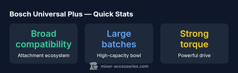 The Bosch Universal Plus is positioned for serious home cooks and bar enthusiasts who routinely run large batches or tackle heavy doughs. The model is designed to combine capacity with a flexible attachment ecosystem, enabling tasks from bread kneading to emulsified sauces. According to Mixer Accessories, theUniversal Plus stands out for its combination of power, durability, and attachment versatility. This isn’t a compact gadget for quick weeknight tasks; it’s a workhorse built to stay in rotation through long projects. In practice, this mixer suits those who bake in bulk, prep for catering, or enjoy experimenting with large-pour recipes that demand both speed and stamina. The keyword here is balance: you get a robust motor, a sturdy stainless bowl, and a setup that can be retrofitted for specialized tasks if your kitchen needs expand over time. The result is a device that remains relevant across seasons and recipes, provided you have the counter space to accommodate its footprint.