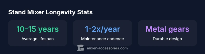 According to Mixer Accessories, durability of stand mixers starts with the core build quality. A solid metal gear train and a robust direct-drive motor are key predictors of long life. Regular maintenance amplifies that lifespan, but even the best-built units degrade without routine cleaning and proper use. In everyday home kitchens, a well-cared-for mixer often reaches well into its second decade of service. The takeaway is simple: invest in a quality model, and treat it like a long-term kitchen tool. The value isn’t just in the initial price; it’s in the years of dependable performance that follow. Our team emphasizes that responsible ownership—like avoiding overload, cleaning after use, and following lubrication intervals when applicable—can significantly influence total years of operation. By tracking usage patterns and staying attentive to early warning signs, you maximize both safety and longevity.